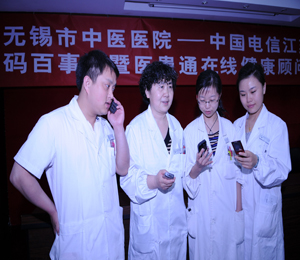 5月25日,江蘇省無(wú)錫市中醫(yī)醫(yī)院18位專家級(jí)醫(yī)師接受了中國(guó)電信江蘇公司的聘請(qǐng),成為無(wú)錫首批電話在線的健康顧問。全省電信用戶只要撥打號(hào)碼百事通118114,即可得到在線醫(yī)療、健康專業(yè)指導(dǎo)。118114健康平臺(tái)還能為出院病人提供康復(fù)指導(dǎo)、動(dòng)態(tài)跟蹤、復(fù)診提醒等健康管理服務(wù)。通過這一形式,能盡快實(shí)現(xiàn)一個(gè)醫(yī)前、醫(yī)中、醫(yī)后服務(wù)鏈。圖為無(wú)錫市中醫(yī)醫(yī)院的健康顧問們?cè)跒榛颊呒w電話會(huì)診。