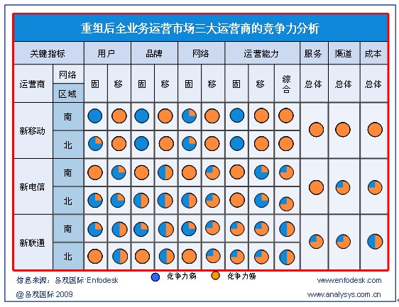 盡管產(chǎn)業(yè)鏈完備程度相差較為明顯,但運(yùn)營(yíng)商各自業(yè)務(wù)與用戶(hù)服務(wù)運(yùn)營(yíng)能力對(duì)3G時(shí)常的發(fā)展影響也至關(guān)重要,根據(jù)易觀國(guó)際Enfodesk發(fā)布的《國(guó)內(nèi)運(yùn)營(yíng)商3G業(yè)務(wù)發(fā)展策略研究系列—中國(guó)3G市場(chǎng)現(xiàn)狀與發(fā)展策略概述》報(bào)告顯示,在發(fā)展3G的過(guò)程中,三大運(yùn)營(yíng)商各自有一定的優(yōu)劣勢(shì):