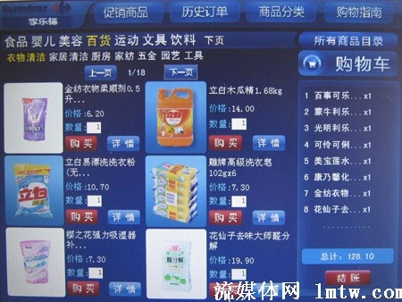 記者在家樂(lè)福IPTV購(gòu)物平臺(tái)上看到,商品的種類相當(dāng)豐富,按日常用到的分成了食品、嬰兒、美容、百貨、運(yùn)動(dòng)、文具、飲料幾個(gè)大類,而每一類里又分成不同的小類,比如美容類里又分護(hù)膚、清潔、男士、彩妝、紙巾等小類。其價(jià)格與在家樂(lè)福購(gòu)物相同,并且還有不少產(chǎn)品在打折。滿118元即可免費(fèi)配送,對(duì)于沒(méi)有時(shí)間、精力逛超市的人來(lái)講,可以說(shuō)相當(dāng)方便。