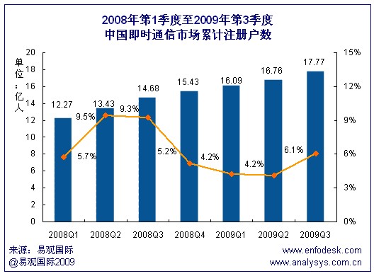 根據(jù)易觀國際Enfodesk產(chǎn)業(yè)數(shù)據(jù)庫即將發(fā)布的《2009年第3季度中國即時(shí)通信市場(chǎng)季度監(jiān)測(cè)》數(shù)據(jù)顯示,2009年第3季度中國即時(shí)通訊市場(chǎng)累計(jì)注冊(cè)賬戶數(shù)達(dá)到17.77億,環(huán)比增長6.1%,同比增長21%。