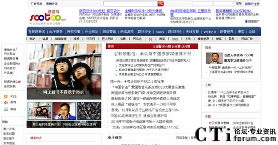 CTI論壇(ctiforum)1月11日消息(記者 張塵):近日,記者獲悉,原天極傳媒集團副總裁、資深媒體人士范鋒正式宣布創(chuàng)業(yè),同時,其所創(chuàng)辦的Web2.0媒體速途網(wǎng)(www.sootoo.com)于今日正式上線。在經(jīng)過近9個月的低調(diào)測試之后,定位于“中國互聯(lián)網(wǎng)行業(yè)媒體和在線服務平臺”的速途網(wǎng)今天以全新版式亮相。