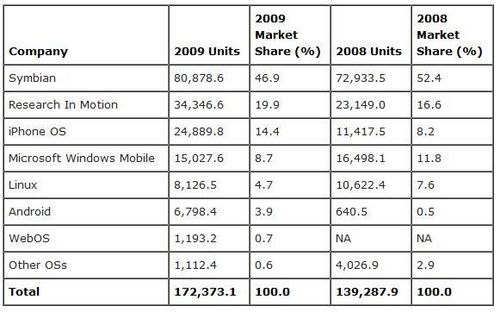 根據(jù)Gartner的數(shù)據(jù)顯示,去年共銷售出的智能手機(jī)達(dá)1.72億部,比前年上漲了24%,然而全世界手機(jī)的銷售總量卻并無起色(2008年為12.2億部,而2009年為12.1億部。在去年銷售的所有手機(jī)中,智能手機(jī)占14%,較2008(11%)年有所提升。iPhone盡管去年漲勢迅猛,只占去年各種手機(jī)銷售總量的2%。