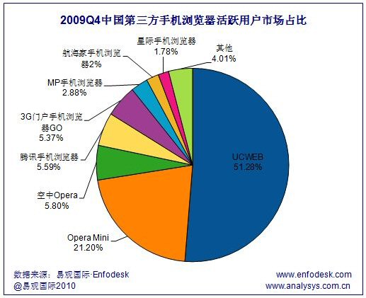 易觀國際(Analysys International)分析認(rèn)為,2009年4季度中國手機(jī)瀏覽器市場隨著騰訊、3G門戶等實(shí)力強(qiáng)勁的廠商發(fā)力,搶占用戶的市場競爭變得日漸激烈。處于不同手機(jī)瀏覽器陣營的廠商都紛紛通過技術(shù)改進(jìn)與大力度的市場營銷廣泛推廣自有產(chǎn)品。