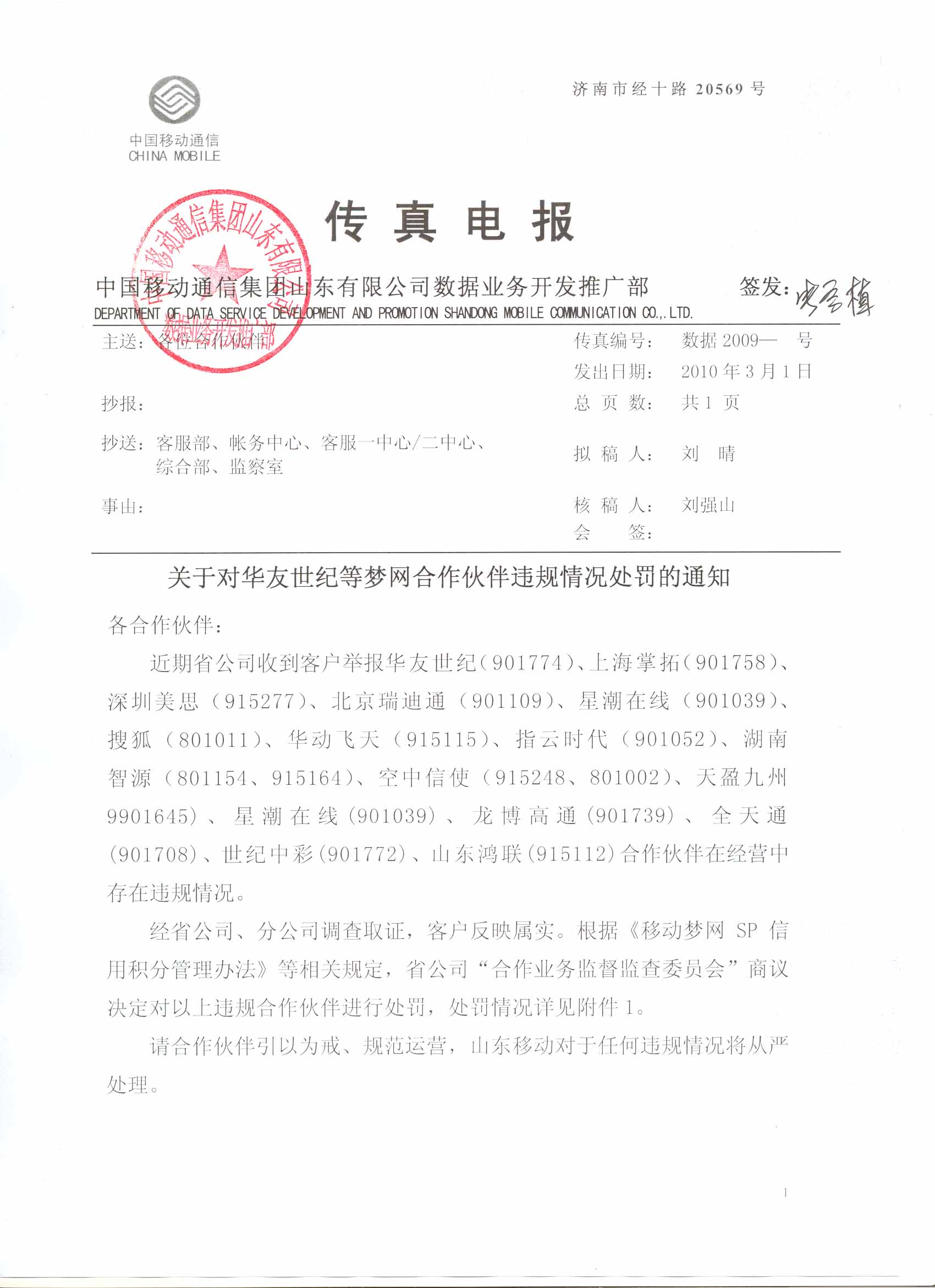 | 7 | 華動飛天 | 915115 | 10663333 | 該公司“圖片點播”業(yè)務,存在未經(jīng)許可隨意更改業(yè)務邏輯和內(nèi)容,影響用戶正常使用和服務。 | 暫停該公司“圖片點播”業(yè)務(業(yè)務代碼:TPC)在山東地區(qū)的服務1個月。扣除信用積分5分。 |