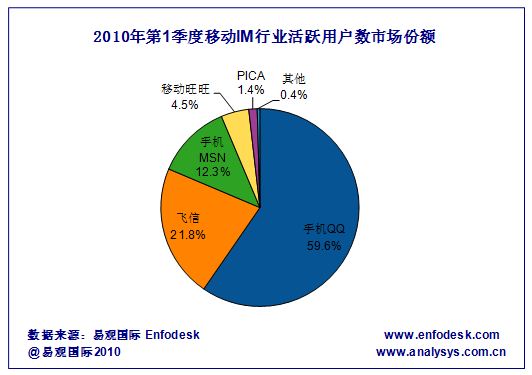 據(jù)易觀國(guó)際Enfodesk產(chǎn)業(yè)數(shù)據(jù)庫(kù)近期發(fā)布的《2010年第1季度中國(guó)市場(chǎng)移動(dòng)IM數(shù)據(jù)監(jiān)測(cè)報(bào)告》研究顯示:2010年第1季度中國(guó)市場(chǎng)移動(dòng)IM活躍用戶數(shù)環(huán)比增長(zhǎng)超過18%,總數(shù)突破1.6億,累計(jì)賬戶數(shù)環(huán)比增長(zhǎng)10.97%,總數(shù)超過3.8億,相比09年第4季度依然取得了較快的增長(zhǎng)。但是基于整體市場(chǎng)來(lái)看,移動(dòng)IM活躍用戶數(shù)市場(chǎng)格局并沒有發(fā)生太大變化,手機(jī)QQ仍然以59.6%的市占率名列市場(chǎng)第一,飛信、手機(jī)MSN位列二三名,具體市場(chǎng)占比及排名如下圖所示: