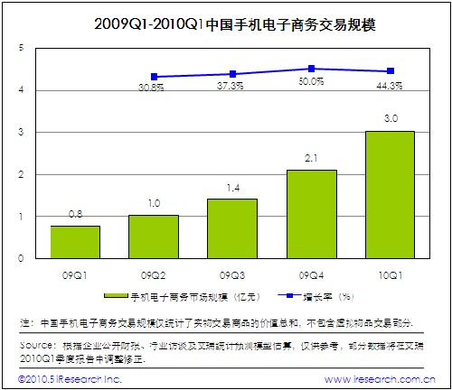 根據(jù)艾瑞咨詢即將發(fā)布的2010年第一季度中國移動互聯(lián)網(wǎng)市場數(shù)據(jù)顯示,2010Q1中國移動互聯(lián)網(wǎng)市場整體交易規(guī)模達到44.9億,環(huán)比增長5.2%。艾瑞咨詢分析認為,盡管電信運營商計費政策調整,對移動增值市場收入產生負面影響,但是手機電子商務、手機搜索等業(yè)務領域的良好市場表現(xiàn),推動移動互聯(lián)網(wǎng)市場規(guī)模平穩(wěn)增長。