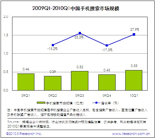 2010Q1中國手機搜索市場規(guī)模為5500萬,環(huán)比增長27.9%,手機搜索請求量和PV的大幅增長帶動廣告收入增加。自2009年下半年以來,受手機上網(wǎng)用戶規(guī)模迅速發(fā)展以及用戶活躍度和黏性顯著增加的影響,手機搜索市場進入快速發(fā)展階段。與此同時,手機搜索企業(yè)紛紛加大市場投入力度,建立與電信運營商和手機終端廠商的深度合作關系是業(yè)務拓展的重點方向。此外,網(wǎng)頁產品和客戶端軟件深度整合也是手機搜索企業(yè)布局移動互聯(lián)網(wǎng)市場的最佳實踐。受谷歌事件影響,艾瑞預計2010Q2手機搜索市場集中度將進一步提高。