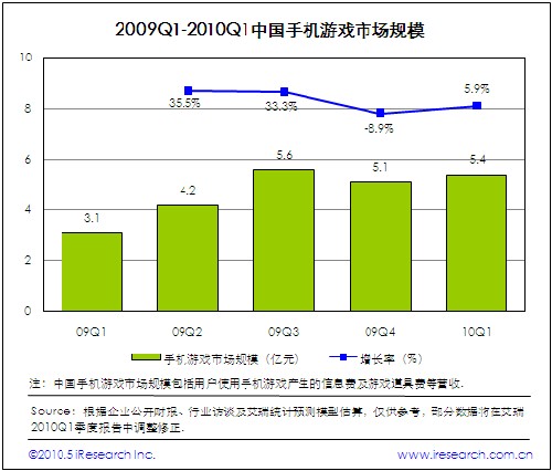 2010Q1中國手機游戲市場規(guī)模為5.4億,環(huán)比增長5.9%.2009年底電信運營商調整業(yè)務合作伙伴計費政策,導致WAP和G+手機游戲平臺等特定計費平臺暫時停止計費,對手機游戲市場營收增長產生不利影響。除了季節(jié)因素以外,手機單機游戲受電信運營商暫停WAP計費影響較大,手機網(wǎng)游受政策影響有限。盡管本季度手機游戲市場扭轉營收規(guī)模下滑的不利局面,重新恢復增長態(tài)勢,但是手機游戲對電信運營商計費通道的高依存度,決定行業(yè)受政策風險的影響較大。實現(xiàn)營收多元化是手機游戲業(yè)界思考和關注的問題。