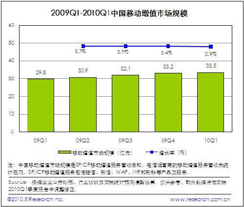 電信運營商計費政策重大調整對整個移動增值市場產生巨大影響力,2010Q1移動增值市場規(guī)模為33.5億,與09Q1基本持平。電信運營商實施計費通道的強力治理措施,對產品線以WAP計費為主的企業(yè)造成嚴重生存壓力,與此同時采用短信計費的移動增值產品營銷也受到不同程度影響。實現(xiàn)由單一移動增值業(yè)務向移動互聯(lián)網(wǎng)服務進行戰(zhàn)略轉型,是SP企業(yè)戰(zhàn)略發(fā)展的實踐路徑。艾瑞認為電信運營商實施全新的合作伙伴計費政策,將重新構建移動增值市場秩序。
