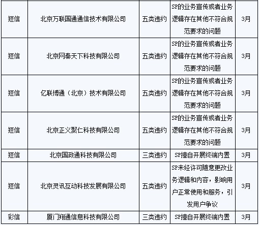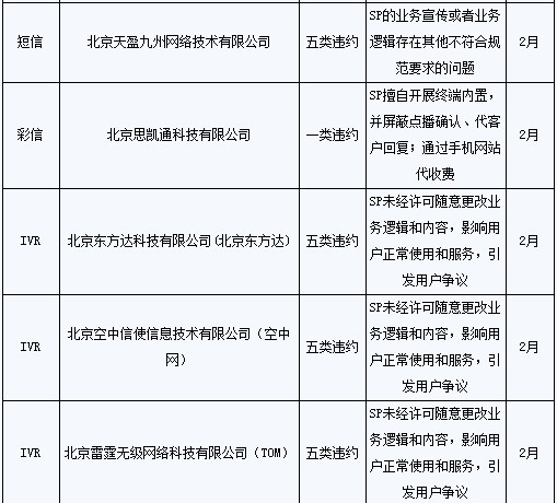 同時,8家SP本地業(yè)務(wù)數(shù)據(jù)2010年5月在相關(guān)系統(tǒng)進行暫停,月底進行全面清除;其本地業(yè)務(wù)的計費、結(jié)算和付款工作從2010年5月開始全部終止;此外,1年內(nèi)不接受該8家SP的新接入申請。