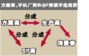 中國(guó)移動(dòng)2007年1月出臺(tái)的《移動(dòng)夢(mèng)網(wǎng)SP合作管理辦法》規(guī)定,禁止SP和終端廠家直接進(jìn)行終端內(nèi)置業(yè)務(wù)的合作。但是,大部分國(guó)產(chǎn)手機(jī)生產(chǎn)環(huán)節(jié)當(dāng)中,都有一個(gè)重要的角色,那就是手機(jī)方案商。方案商主要負(fù)責(zé)提供整套手機(jī)設(shè)計(jì)方案,包括研發(fā)手機(jī)主板、設(shè)計(jì)操作系統(tǒng),他們把帶有操作系統(tǒng)的主板賣(mài)給手機(jī)生產(chǎn)商,生產(chǎn)商再采購(gòu)?fù)鈿ぁ⒁壕恋炔考M裝成成品手機(jī)。
