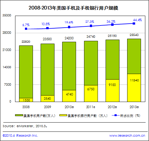 艾瑞咨詢根據(jù)eMarketer的統(tǒng)計(jì)數(shù)據(jù)發(fā)現(xiàn),2010年美國(guó)手機(jī)銀行用戶占其手機(jī)用戶的比例將達(dá)到19.6%,到2013年將增長(zhǎng)至44.4%。
