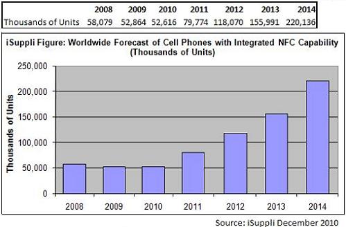 據市調機構iSuppli預估,到2014年,全球內建NFC的手機出貨量可望達到2.201億部,2010年該數字為5,260萬部。到了2014年,約有13%的手機內建NFC功能,而2010年該數字為4.1%。