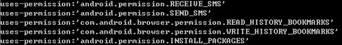 圖:增加的權(quán)限部分:加了收取和發(fā)送短信以及讀取和寫(xiě)入書(shū)簽的權(quán)限