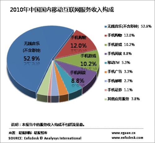 從收入構(gòu)成看來(lái),無(wú)線音樂、手機(jī)游戲、手機(jī)閱讀逐漸成為三大主要移動(dòng)互聯(lián)網(wǎng)娛樂應(yīng)用,手機(jī)購(gòu)物增速明顯。