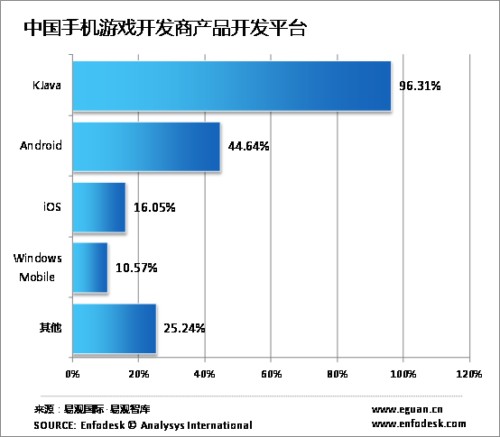 根據(jù)易觀國際的數(shù)據(jù)顯示,截至2010年底,中國手機(jī)游戲用戶規(guī)模突破1.3億,同比增長52.11%,同期中國手機(jī)游戲市場規(guī)模達(dá)33億,伴隨著整體市場的發(fā)展手機(jī)游戲開發(fā)商隊(duì)伍也逐漸完善;為了更好的研究手機(jī)游戲市場,近期易觀國際對手機(jī)游戲開發(fā)商進(jìn)行調(diào)研,推出《中國手機(jī)游戲開發(fā)商研究報(bào)告2010》,以期對手機(jī)游戲市場提供有價(jià)值的信息,通過調(diào)研發(fā)現(xiàn)KJava依舊是中國手機(jī)游戲開發(fā)商的主要開發(fā)平臺(tái)。