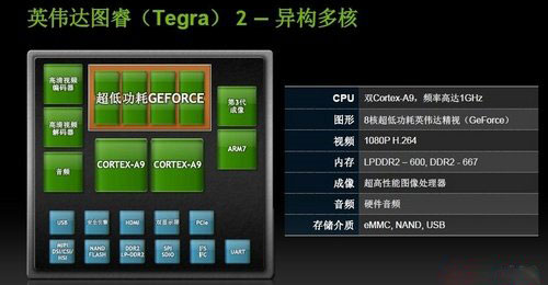 而英偉達圖睿Tegra 2就是專為移動市場而設計的超級芯片,Tegra 2雙核處理器采用了40納米工藝制程,有兩顆Cortex-A9處理器,主頻高達1GHz。Tegra 2處理器芯片只有1/4個硬幣大小,雙核以更低的功耗實現(xiàn)同等性能,多任務處理速度提升一倍,尤其是處理Flash以及HTML5的速度最快。