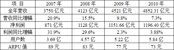 中國移動(dòng)2007年-2010年年度業(yè)績對(duì)比