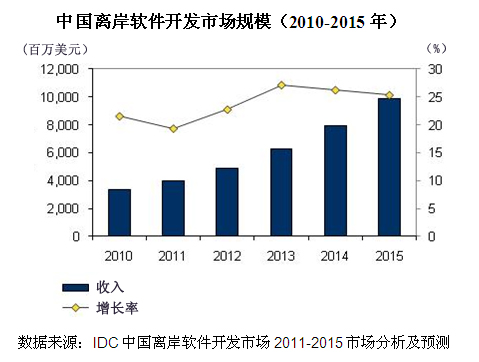 IDC數(shù)據(jù)顯示,2010年中國(guó)離岸軟件開(kāi)發(fā)市場(chǎng)規(guī)模達(dá)到33.57億美元,同比增長(zhǎng)21.6%,預(yù)計(jì)未來(lái)五年將以24.2% 的復(fù)合增長(zhǎng)率快速攀升。