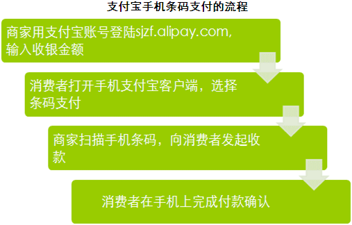 ③ 商家使用條碼槍掃描或輸入消費(fèi)者手機(jī)上的條形碼向消費(fèi)者發(fā)起收款;