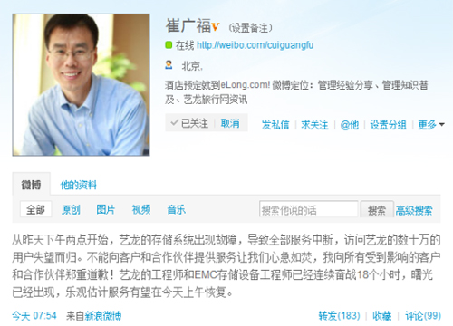 7月12日上午消息,因遭遇存儲(chǔ)故障,從昨日下午2時(shí)起,提供在線(xiàn)服務(wù)的旅游網(wǎng)站藝龍開(kāi)始無(wú)法訪問(wèn),截至目前已經(jīng)過(guò)去了20個(gè)小時(shí)。藝龍CEO崔廣福通過(guò)新浪微博表示,藝龍工程師和EMC存儲(chǔ)工程師正在緊張搶修中,預(yù)計(jì)今天上午能夠恢復(fù)正常。新浪科技