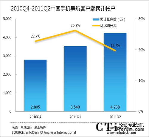 2011年Q2中國手機導(dǎo)航客戶端累計帳戶達(dá)4238萬