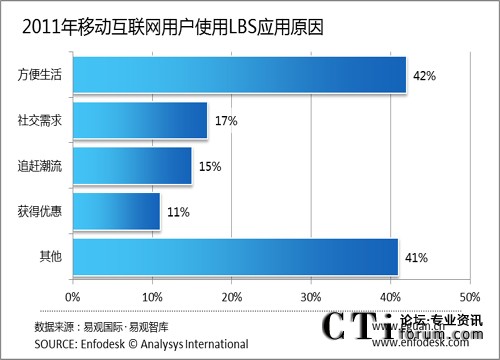 CTI論壇(ctiforum)8月26日消息(記者 張潔):根據(jù)易觀(guān)國(guó)際(Analysys international)最新調(diào)研顯示,42%的使用LBS用戶(hù)認(rèn)為使用應(yīng)用程序可以方便生活,17%的用戶(hù)認(rèn)為是社交需求,15%的用戶(hù)只是出于追趕潮流的目的,11%的用戶(hù)認(rèn)為使用LBS應(yīng)用程序可以獲得一定的優(yōu)惠。