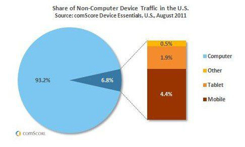 市場研究公司comScore發(fā)表報告稱,8月份,智能手機和平板電腦等“非計算機”設(shè)備在美國互聯(lián)網(wǎng)流量中的份額由6月底時的6.2%增長至6.8%。