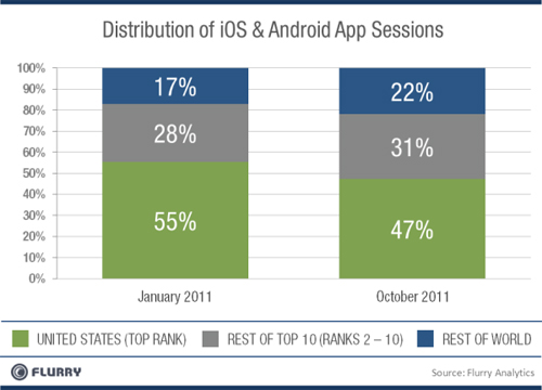 使用iOS和Android設(shè)備和其他新技術(shù)一樣,最早開始于可支配收入較高的北美和西歐地區(qū)。然而,隨著型號較舊的iOS產(chǎn)品價格下降,以及Android設(shè)備的生產(chǎn)商提供了更多大家買得起的低價設(shè)備,包括新興市場在內(nèi)的國際市場的消費者越來越多。下圖顯示了移動應(yīng)用下載如何擴張到美國之外。