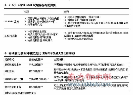 對此,國金證券發(fā)布了一份研究報告稱,相對于13 .56MHz方案而言,2.4GHz方案在推廣上有先天的優(yōu)勢。畢竟13.56M H z方案必須對手機重新設(shè)計,需要等待手機產(chǎn)業(yè)鏈對13.56M H z的逐步支持,時間周期較長;同時,更換13.56M H z手機帶來的重置成本無論是由用戶承擔(dān)還是由運營商承擔(dān)都是一筆高額的費用,推廣難度較高。而2.4G H z方案僅需更換SIM卡便可完成對手機的改造,不用等待終端產(chǎn)業(yè)鏈的成熟;同時改造成本低,便于運營商進(jìn)行促銷推廣。