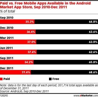 通過對2010年9月至2011年12月Android Market應用商店的分析,進一步表明了對免費應用模式的依賴性。根據(jù)第三方應用程序跟蹤服務AndroLib提供的數(shù)據(jù),2010年9月Android Market應用商店下載的大約65%應用均為免費應用;在2011年12月,這一比例已經(jīng)提升至69%。