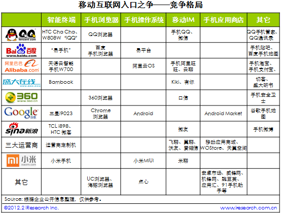 2011年,移動互聯(lián)網(wǎng)領域發(fā)展熱度很高,競爭激烈。艾瑞咨詢整理發(fā)現(xiàn),移動端的“用戶入口”成為傳統(tǒng)互聯(lián)網(wǎng)巨頭、移動運營商和移動互聯(lián)網(wǎng)企業(yè)競爭的聚焦點。這充分體現(xiàn)出,第一,移動互聯(lián)網(wǎng)的發(fā)展前景好,第二,移動互聯(lián)網(wǎng)目前仍處在用戶積累和行為培養(yǎng)的過程。