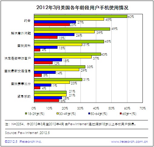 iResearch艾瑞咨詢根據(jù)Pew Internet 2012年5月發(fā)布的數(shù)據(jù)整理發(fā)現(xiàn),美國(guó)各年齡段手機(jī)用戶中,18-29歲的用戶使用手機(jī)程度最為頻繁,主要用于“約會(huì)”“解決意外問(wèn)題”及“查找資料”上。相比其他年齡段用戶群,年輕用戶更偏向利用移動(dòng)手機(jī)來(lái)獲取信息。