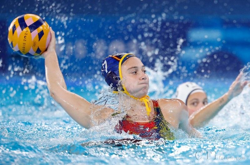 8月4日,西班牙隊球員埃萊娜(左)在比賽中。當(dāng)日,在巴黎奧運會女子水球小組賽B組比賽中,西班牙隊13比11戰(zhàn)勝意大利隊。新華社記者 張玉薇 攝