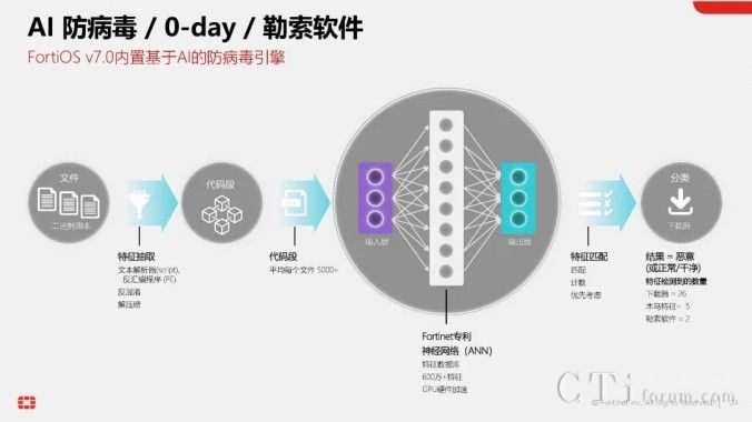 目前,AI技術(shù)已深度融入Fortinet的數(shù)十種產(chǎn)品與方案中。在最新版的統(tǒng)一網(wǎng)絡(luò)安全操作系統(tǒng)FortiOS 7.6中,就已經(jīng)內(nèi)置了由FortiGuard AI實驗室研發(fā)的基于AI的防病毒引擎。該引擎運用神經(jīng)網(wǎng)絡(luò)技術(shù),學(xué)習(xí)并區(qū)分海量病毒文件與正常文件,通過分類打分的方式,實現(xiàn)對未知文件與病毒的精準判斷,無需依賴傳統(tǒng)的病毒特征庫。因此,F(xiàn)ortinet的FortiGate等產(chǎn)品在防病毒方面擁有雙引擎加持,既有傳統(tǒng)的基于病毒特征庫的防病毒引擎,又有基于AI的下一代防病毒引擎(Anti-virus NGAV),雙重保障,安全無憂。