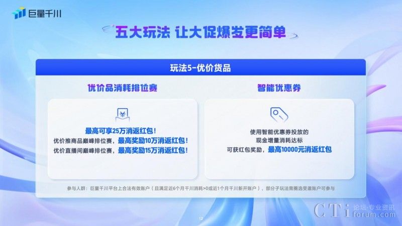 四、「重點(diǎn)產(chǎn)品玩法」:「全域推廣」和「新品起量」兩個(gè)巨量千川平臺(tái)重點(diǎn)產(chǎn)品,也推出了系列玩法。全域推廣對新客、完成有效測試的客戶發(fā)放全域推廣專屬紅包,最高達(dá)28888元,參與全域增長消耗排位賽也可獲得高達(dá)50000元的消返紅包。新品起量基準(zhǔn)期新客現(xiàn)金消耗≥300元,可獲得100元消返紅包獎(jiǎng)勵(lì),老客現(xiàn)金消耗≥500元,即可得到100元消返紅包獎(jiǎng)勵(lì)。