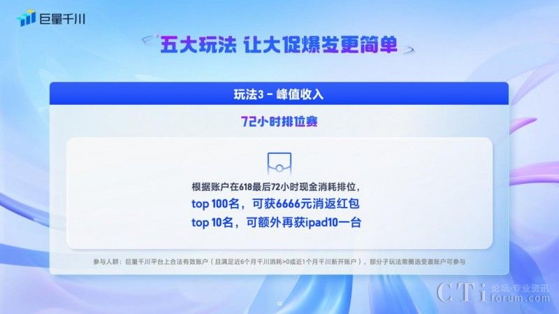 三、「72小時(shí)排位賽 」:針對巨量千川平臺(tái)上合法有效賬號(hào),且滿足近6個(gè)月千川消耗>0或近1個(gè)月千川新開賬戶,按照商家的峰值收入可以參與72小時(shí)排位賽,根據(jù)賬戶在618最后72小時(shí)現(xiàn)金消耗進(jìn)行排位,排位Top100的商家可得6666元消返紅包,Top10可額外再得ipad10一臺(tái)。