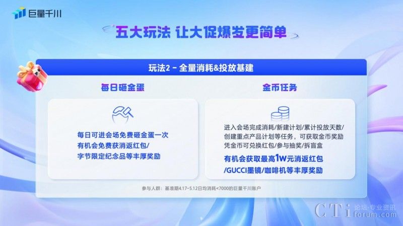 二、「每日砸金蛋&金幣任務(wù)」:針對在618好物節(jié)期間現(xiàn)金消耗對比基準(zhǔn)期消耗增長率未達(dá)標(biāo)的商家,可參與每日砸金蛋和金幣任務(wù)。商家每日可進(jìn)入會(huì)場免費(fèi)砸金蛋一次,就有機(jī)會(huì)免費(fèi)獲得消返紅包和字節(jié)限定紀(jì)念品等獎(jiǎng)勵(lì)。此外,商家進(jìn)入會(huì)場完成消耗/新建計(jì)劃/累計(jì)投放天數(shù)/創(chuàng)建重點(diǎn)產(chǎn)品計(jì)劃等任務(wù),可獲取金幣獎(jiǎng)勵(lì),憑金幣可兌換紅包、參與抽獎(jiǎng)和拆盲盒等豐厚獎(jiǎng)勵(lì),最高可得10000元消返紅包。