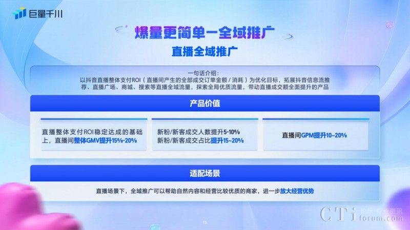 獲取生意增量是商家生意經(jīng)營的重中之重,升級后的全域推廣分為直播全域推廣和商品全域推廣,讓爆量變得更簡單。直播全域推廣打通廣告和自然流量,以抖音直播整體ROI為優(yōu)化目標(biāo),拓展抖音信息流推薦、直播廣場、商城、搜索等直播全域流量,帶動(dòng)直播成交額全面提升,放大直播生意,直播間整體GMV提升15%~20%,新客/新粉成交占比提升15%~20%。