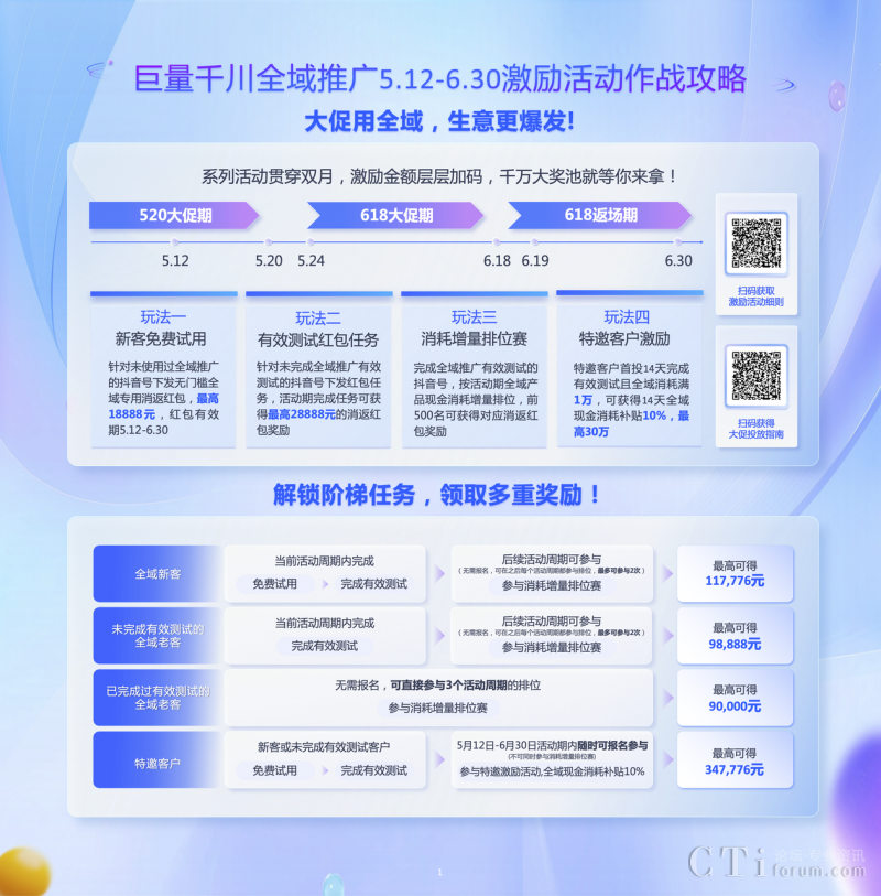 在此次巨量千川618好物節(jié)期間,全域推廣系列活動(dòng)貫穿雙月,激勵(lì)金額層層加碼,更有多重獎(jiǎng)勵(lì),獎(jiǎng)池金額累積千萬。全域推廣針對全域新客發(fā)放高達(dá)18888元的全域推廣專屬紅包;對于未完成全域有效測試的商家在活動(dòng)期完成有效測試任務(wù)可獲得最高28888元的消返紅包;以及參與全域推廣消耗排位賽,最高可得50000元消返紅包;對于特邀客戶首投14天完成有效測試且全域消耗滿1萬,可獲得14天全域現(xiàn)金消耗補(bǔ)貼10%,最高達(dá)30萬。