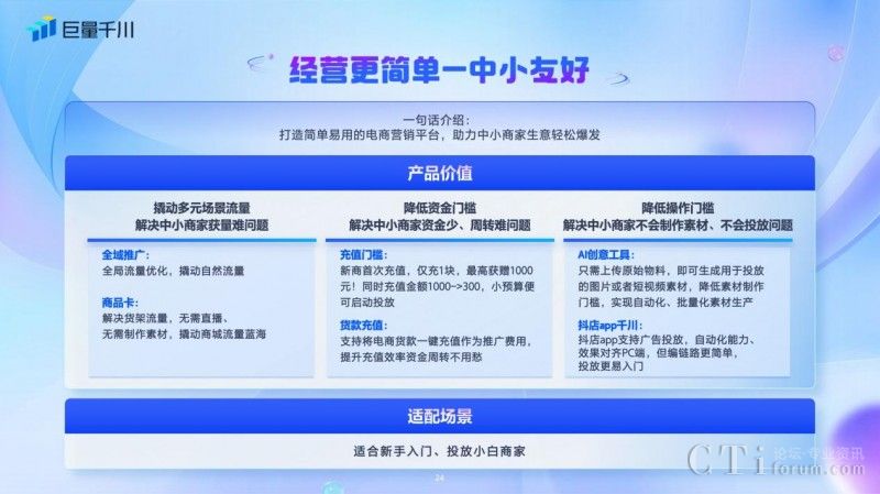 針對中小商家經(jīng)營長效問題,巨量千川打造簡單易用的電商營銷平臺(tái)。撬動(dòng)多元場景流量,解決中小商家獲量難題;降低資金門檻,解決資金少、周轉(zhuǎn)難的問題;降低素材制作操作門檻,解決商家“不會(huì)投”、“不敢投”的難題,讓經(jīng)營更簡單。