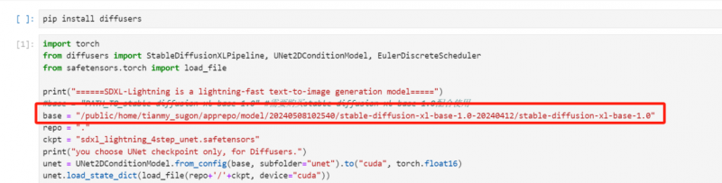 第三步,商城首頁中選擇 SDXL-Lighting 系列模型商品,免費購買后點擊“一鍵試用”。進(jìn)入notebook頁面后選擇“Python3.9”內(nèi)核,將第二步復(fù)制路徑粘貼到代碼的 base 變量中,點擊保存。