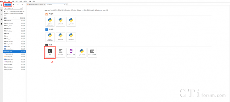 參加本次活動,用戶只需四步就可開啟AI作圖之旅。第一步,在商城選擇stable-diffusion-xl-1.0 商品后點擊“立即使用”,并在后續(xù)出現(xiàn)的notebook頁面點擊左上角“+”,以此進(jìn)入終端頁面。
