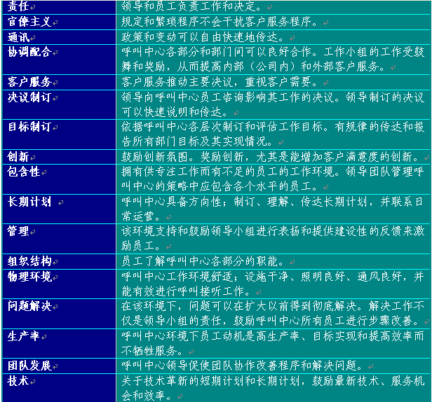 附錄6提供了建議的員工滿意度調(diào)查表。可以作為準備制訂呼叫中心使用的版本的起點。在制訂表格時,應(yīng)從所有中心最佳實踐工作和領(lǐng)導團隊確認的其他部門取得評估要素。表格6總結(jié)了呼叫中心員工滿意度調(diào)查應(yīng)包含的主要方面: