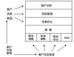真正的CRM解決方案是一個(gè)復(fù)雜的聯(lián)合體,它由許多組件(即分析工具、活動管理與事件引發(fā)等)與許多需要用來達(dá)到一對一的營銷能力(如間接管理、基于規(guī)章制度的工作流管理以及真正的渠道管理等)的新組件共同組成。此外,在非客戶聯(lián)系系統(tǒng)(如企業(yè)資源規(guī)劃與操作)與客戶聯(lián)系系統(tǒng)之間必須有接口。最后,在企業(yè)內(nèi)建立一套完整的便于知識管理的反饋循環(huán)系統(tǒng)也很必要。
