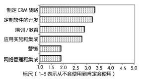 通常,通信提供商相對而言不愿意求助于專業(yè)服務公司來幫助其實施CRM解決方案。在1~5的標尺中,只有積分為5的公司可能使用專業(yè)服務公司,分數(shù)低于3.5的公司沒有一家會這么做,這表明通信提供商仍由內(nèi)部人員來實施多數(shù)功能。調(diào)查的分數(shù)表明他們最可能與外部服務提供商合作制定戰(zhàn)略——定制軟件開發(fā)(3.33)和培訓(3.22)。他們最不可能求助此類公司來從事網(wǎng)絡管理和集成(1.89)或營銷(1.89)工作。圖3顯示的就是這些調(diào)查結(jié)果。