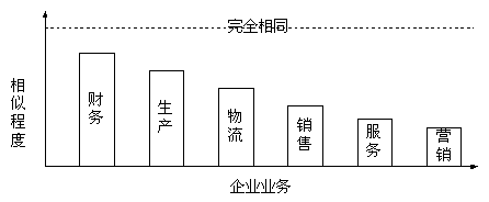 很顯然,企業(yè)間業(yè)務(wù)的相似程度越高,采用商用軟件的有效率越高,企業(yè)在采用商用軟件的時候軟件的客戶化定制就越少,實(shí)施的成功率越高。財務(wù)軟件是目前商用軟件通用最有效的企業(yè)管理軟件就是明證。從圖中可以看出前面的幾種業(yè)務(wù),是 傳統(tǒng)ERP軟件支持的功能;而后面的銷售、服務(wù)和市場是目前CRM軟件所要實(shí)現(xiàn)的功能。如果說,企業(yè)采用現(xiàn)有的ERP商品套件來滿足企業(yè)運(yùn)營管理的需要還需要30%的客戶化工作,那么如果采用商用的CRM軟件,軟件廠商提供的軟件要應(yīng)用于企業(yè),就需要更多的客戶化工作,這個比例幾乎接近于企業(yè)自己開發(fā)。