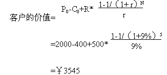 下面舉另一個(gè)例子具體說明客戶價(jià)值的計(jì)算: 假設(shè)客戶與公司保持交易時(shí)間:N=5年;公司最初吸引每個(gè)客戶的成本(營(yíng)銷費(fèi)用): C0=¥400;客戶第一次購買的產(chǎn)品價(jià)格:P0=¥2000;公司期望每年從每個(gè)客戶處增加的收入:R=¥500;利率(一般指貸款利率): r =9%;那么客戶的價(jià)值等于:客戶初次購買產(chǎn)品和以后幾年每年消費(fèi)價(jià)值的折現(xiàn)之和,減營(yíng)銷成本,即: