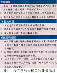 為了獲得真正智能化的企業(yè)客戶管理,信息結(jié)構(gòu)必須與商業(yè)智能無(wú)縫集成。圖1描述了與信息結(jié)構(gòu)相關(guān)的業(yè)務(wù)需求。這種需求和結(jié)構(gòu)引起的信息技術(shù)問(wèn)題使得實(shí)現(xiàn)真正的集成化迫在眉睫。