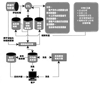 關(guān)系數(shù)據(jù)庫(kù)系統(tǒng)有三種主要數(shù)據(jù):典型客戶案例的詳細(xì)數(shù)據(jù)、對(duì)所有客戶的總結(jié)性歷史數(shù)據(jù)以及具體活動(dòng)的數(shù)據(jù)。分析數(shù)據(jù)庫(kù)提供輸入數(shù)據(jù),從而得到對(duì)客戶的認(rèn)識(shí),而滿足ETL處理的業(yè)務(wù)規(guī)則庫(kù)為分析數(shù)據(jù)庫(kù)提供派生屬性。這個(gè)過(guò)程將保持離線分析和實(shí)時(shí)事件觸發(fā)規(guī)則之間的同步,在動(dòng)態(tài)建立表格的過(guò)程中處理初始化完成后的派生屬性相加,并對(duì)相應(yīng)的元數(shù)據(jù)進(jìn)行更新,這些處理都是自動(dòng)實(shí)現(xiàn)的。